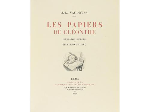 1928. LIBRO. (BIBLIOFILIA). ANDREÙ, MARIANO; VAUDOYER, J.L.:. LES PAPIERS DE CLÉONTHE. Euaux-fortes originales de... París: Ed. de la Chronique des Lettres Françaises aux Horizons de France, 1928. 4º mayor. 247 p. + 1 h. Con 28 aguafuertes, 10 de ellos a toda plana. Rústica edit., con funda y petaca de cartoné. Ejemplar de los 10 tirados sobre papel japón, de un total de 300. Contiene una suite de los aguafuertes en negro en papel china. Incluye además dos cartas manuscritas, una de mano del artista dirigida al profesor Emile ¿Schaubakech?, fechada el 27 de diciembre de 1952 en París y que lleva grapada una foto de los bocetos de unos dibujos suyos. Otra carta de otra mano pero con su firma, enviada a "Tragaviento" (¿editorial?), fechada en Biarritz en agosto de 1952 y que también lleva dos fotografías de las obras en las que estaba trabajando.