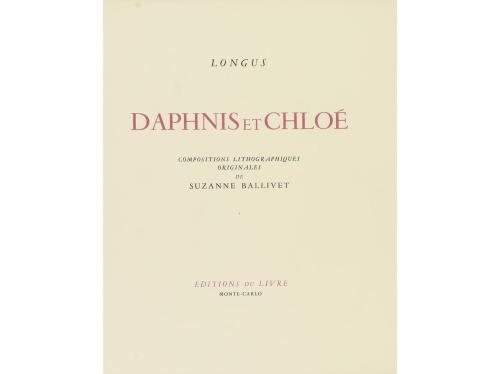 1946. LIBRO. (BIBLIOFILIA). LONGUS:. DAPHNIS ET CHLOÉ. Monte-Carlo: Editions du livre: 1946. 4º mayor. 198 p. + 4 h. Ilustr. con litografías de Suzanne Ballivet. En rama, presentado en funda y petaca de cartoné, decoradas.