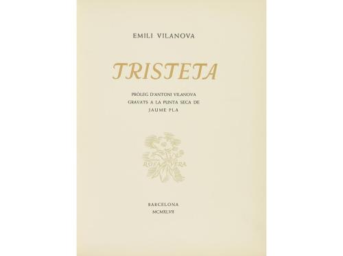 1947. LIBRO. (BIBLIOFILIA). VILANOVA, EMILI; PLA, JAUME (ilustr.):. TRISTETA. Pròleg Antoni Vilanova. Barcelona: Ed. Rosa Vera, 1947. 4º. Societat Aliança d´Arts Gràfiques, 1947. 4º menor. 143 p. 14 grabados a la punta seca de Jaume Pla. Edición de 150 ejemplares numerados sobre papel de hilo. Enc. en piel, rozada.