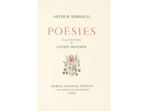 1953. LIBRO. (BIBLIOFILIA). RIMBAUD, ARTHUR:. POÉSIES. Paris: Marcel Lubineau, éditeur, 1953. 4º mayor. 157 p. + 1 h. Ilustr. en el texto con grabados al boj por Pierre Bouchet, coloreados a la acuarela. Edición numerada y alimitada a 750 ejemplares. En rama, rústica, funda y petaca.