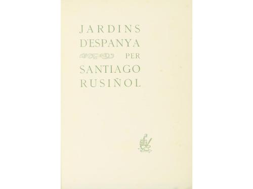 1903. LIBRO. (BIBLIOFILIA). RUSIÑOL, SANTIAGO:. JARDINS D'ESPANYA. Barcelona: 1903. Folio mayor. 30 p. y 40 láminas (completo) con sello seco en el papel, conserva todas las hojas protectora con el título de cada obra. Puntos de óxido. Encuadernación de la época en rústica y presentado en una carpeta con cintas.