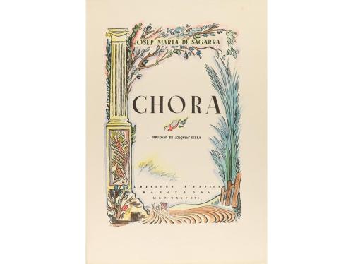 1938. LIBRO. (BIBLIOFILIA). SAGARRA JOSEP MARIA DE:. CHORA. Barcelona: Ed. l'Espiga, 1938. Folio. 71 p. + 4 h. Ilustrado con dibujos coloreados a mano, de Joaquim Serra en el texto. Edición numerada de 25 ejemplares sobre papel de hilo. En rama y carpeta.