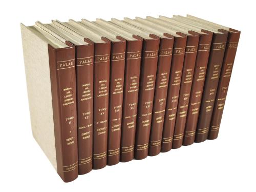 1948-1977. LIBRO. (BIBLIOGRAFIA). PALAU Y DULCET, ANTONIO:. MANUAL DEL LIBRERO HISPANOAMERICANO. Bibliografía general española e hispanoamericana desde la invención de la imprenta hasta nuestro tiempos con el valor comercial de los impresos descritos. Barcelona [and Oxford]: Llibreria Palau [The Dolphin Book], 1948 - 1977. 28 vol. en 4º mayor. La mejor bibliografía Española e Iberoamericana publicada. Describe 381897 obras, con sus comentarios y tasaciones. La información que contiene esta bibliografía aún no ha sido digitalizada, por lo cual su consulta continúa siendo de referencia. 28 vol. muy bien enc. en media piel. Enc. muy sólida, ideal para el uso intensivo que este manual debe tener. [Más:] INDICE ALFABETICO DE TITULOS-MATERIAS, CORRECCIONES, CONEXIONES Y ADICIONES DEL MANUAL DEL LIBRERO HISPANOAMERICANO. Id.: Palacete Palau Dulcet, 1981-1987. 7 vols. 400 p. Rústica. Ejemplar completo, junto con los índices en buen estado de conservación.