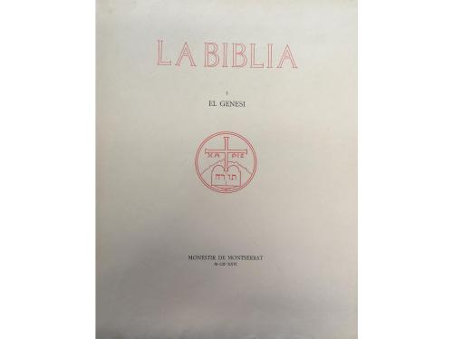 1926-1954. LIBRO. (BIBLIOFILIA). LA BIBLIA. Versió dels textos originals i comentari pels monjos de Montserrat. Monestir de Montserrat, 1926-1954. 25 tomos en 28 vol. en folio, excepto 2 vol. en 4º mayor. Contiene todos los libros del AT y NT a falta de un vol. (18-II que corresponde a los evangelios de Marcos y Lucas). Se tiraron 20 ejemplares sobre papel japón imperial de los que en este set hay 10 volúmenes, el resto son de la tirada de 85 sobre papel de hilo con filigrana "Montserrat". Los dos volúmenes en 4º , enc. en tela edit. con sobrecubierta, son de la tirada de 1500 (Sabiduría/ Eclesiástico, I y II de Macabeos). Son en papel japón los siguientes: todo el Pentateuco (3 vol.), Salmos (2 vol.), Isaías (2 vol.), Evangelio de Juan-Hechos de los Apóstoles (1 vol.) y las Epístolas de San Pablo (2 vol.) Todos en rústica original salvo lo indicado, intonsos. Palau 29194.
