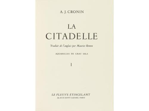 1950 ca. LIBRO. (BIBLIOFILIA-ARTE). CRONIN; GRAU SALA [ilustr.]:. LA CITADELLE. Traduit de l'anglais par Maurice Rémon. Paris: Le fleuve étincelant, 1950 ca. 2 vol. en 4º mayor. I: 364 p. + 2 h. II: 336 p. + 4 h. Bellamente ilustrado por GRAU SALA. Los dos vol. presentados en funda y petaca original, ligeramente rozada. Ejemplar de los 25 numerados sobbre papel Velin d'Arches que contiene tres ACUARELAS ORIGINALES del artista, de un tiraje total de 500.