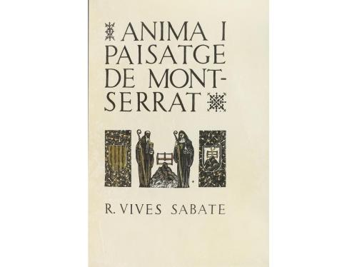 1950. LIBRO. (BIBLIOFILIA-MONTSERRAT). VIVES SABATE, R.:. ANIMA Y PAISATGE DE MONTSERRAT. Vilanova i la Geltrú: R. Vives Sabaté, 1950. 4º mayor. 202 p.+ 5 h. Lám. e ilustr. grabadas al boj y coloreadas a mano por VIVES I SABATE. Enc. en pleno pergamino con hilos dorados en ambos planos y la imagen de la Moreneta en dorado en el plano anterior, nervios, corte superior dorado, firmada por Balmes. Ejemplar ÚNICO impreso sobre pergamino, con la firma del autor en la justificación del tiraje.