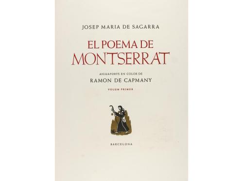 1950. LIBRO. (BIBLIOFILIA-MONTSERRAT). SAGARRA, JOSEP MARIA DE; MARLET, RICARD [grabados]:. POEMA DE MONTSERRAT. Barcelona: 1950. 4 volúmenes en folio mayor. I: 201 p.+ 3 h. II: 281 p.+ 3 h. III: 253 p.+ 3 h. IV: 191 p.+ 3 . Ilustrado con 44 aguafuertes coloreados de Ramon de Capmany. Letras capitulares y grabados al boj de Ricard Marlet. En rama, presentados en funda y petaca, lomo de pergamino. Ejemplar de los XX numerados en cifras romanas y con la firma del traductor, un apunte del artista una prueba en sanguina y el estado definitvo de las planchas, de una tirada total de 225 ejemplares.