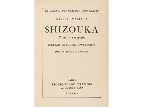 1929. LIBRO. (BIBLIOFILIA). YAMATA, KIKOU:. SHIZOUKA, PRINCESSE TRANQUILLE. París: Trémois, 1929. 8º. 101 p. Frontis del autor dibujado por Foujita. 14 lám. con dibujos fuera del texto. Enc. en plena piel, nervios. Edición numerada de 950 ejemplares sobre papel de hilo. Conserva la cubierta originial.