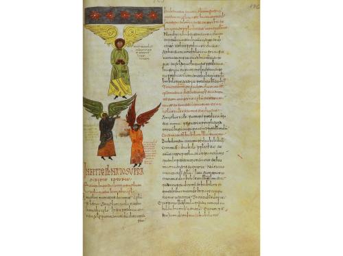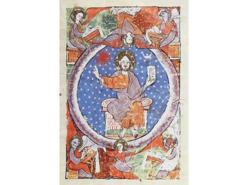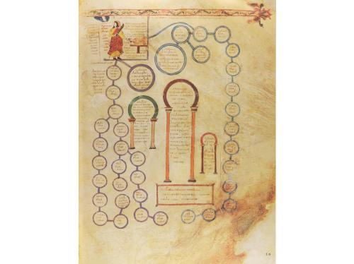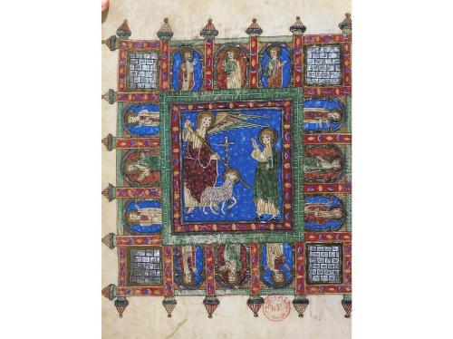 1998. LIBRO. (FACSÍMIL). EL BEATO DE LIÉBANA. CÓDICE DEL MONASTERIO CISTERCIENSE DE SAN ANDRES DE ARROYO. Barcelona: Ed. Moleiro, 1998. Folio imperial. Aprox. 166 fol. iluminados. Enc. plena piel ante, nervios, tachuelas en los planos. Presentado en un estuche de piel con dorados en los planos. Edición numerada y limitada a 987 ejemplares, con acta notarial. Escrito en letra gótica carolíngia entre 1219 y 1235 para Fernando III el Santo, único ejemplo en combinación de elementos arcaicos y tardíos del medievo. Las similitudes estilísticas con el Beatus de Cardeña nos hacen pensar que quizás fue ilustrado en el Monasterio de San Pedro de Cardeña.