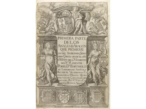 1630. LIBRO. (DERECHO-ARAGÓN). PRIMERA PARTE DE LOS ANALES DE ARAGON QUE PROSIGUE LOS DEL SECRETARIO GERONIMO ÇURITA DESDE EL AÑO MDXVI... POR... Çaragoça: Imp. Iuan de Lanaja, 1630. 4º mayor. Frontis grabado + 14 h. + 1128 p. + 20 h. Portada con impresionante grabado arquitectónico firmado por Josephus Valles, texto a dos columnas, con llamada, apostillas marginales. Capitales. Enc. en pergamino de época, lomera rotulada, semidesprendido. Buen ejemplar, con alguna galería marginal sin afectar el texto. Palau 16096. Primera edición de la obra más importante de este historiador oscense y una de las grandes crónicas aragonesas. Abarca la historia de los territorios europeos y americanos.