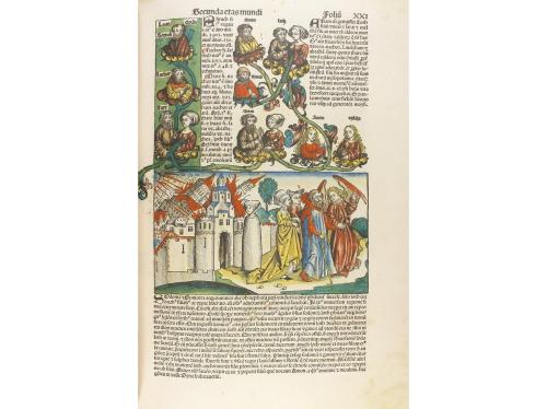 2003. LIBRO. (FACSÍMIL). LIBER CHRONICARUM. Burgos: Ed. Gil de Siloé, s.l. Gran folio. 658 páginas imitación pergamino, con la reproducción facsimilar del incunable más ilustrado del mundo, impreso por Antonius Koberger y custodiado en el Monasterio de Santa María de la Vid. Enc. en plena piel con decoración gofrada, alguna leve rozadura. Cierres metálicos, uno roto. Presentado en un estuche de tela. Ejemplar numerado de la edición limitada a 898. Esta obra recoje la historia del mundo desde la Creación hasta 1492. Ilustrado con más de 1800 xilografías dibujadas por el maestro de Durero, Michael Wolgemuth, coloreados por un artista anónimo que reproducen temas bíblicos y profanos, árboles genealógicos, mapas, vistas de ciudades, retratos e imágenes de seres monstruosos... Esta obra recibió el premio del Ministerio de Educación, Cultura y Deporte en el 2003 en la categoría Libros Mejor Editados, modalidad Facsímil. Con el libro de estudio en su petaca original.
