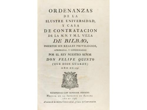 1796. LIBRO. (DERECHO). ORDENANZAS DE LA ILUSTRE UNIVERSIDAD, Y CASA DE CONTRATACION DE LA M.N. Y M.L. VILLA DE BILBAO, INSERTOS SUS REALES PRIVILEGIOS, APROBADAS, Y CONFIRMADAS POR EL REY NUESTRO SEÑOR DON FELIPE QUINTO (QU. Madrid: Imp. de Sancha, 1796. 4º mayor. Frontis grabado + 2 h. + 370 p. + 33 h. de índices. Finas galerías a lo largo de la obra, más profundas en la esquina inferior en las hojas de índices. Enc. original en pasta española, nervios, cantos y lomera rozados.