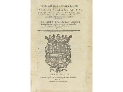 1569. LIBRO. (DERECHO CANÓNICO). DE CATHOLICIS INSTITUTIONIBUS. Compluti: Apud Andream de Angulo,1569. 4º mayor. 18 h. + 310 fol. a dos columnas. Capitales xilográficas. El útlimo folio presenta finas galerías y rasgadura marginal, sin pérdida. En colofón la fecha que consta es 1568. Escudo xilográfico grabado en la portada. Algún cerco marginal de humedad. Enc. de piel ante, sobre tabla, con refuerzos de pergamino en el interior de la lomera, nervios, marcas de haber tenido cierres, en el corte largo escrito "SIMANCAS", en tinta. CCPB 186235-9.