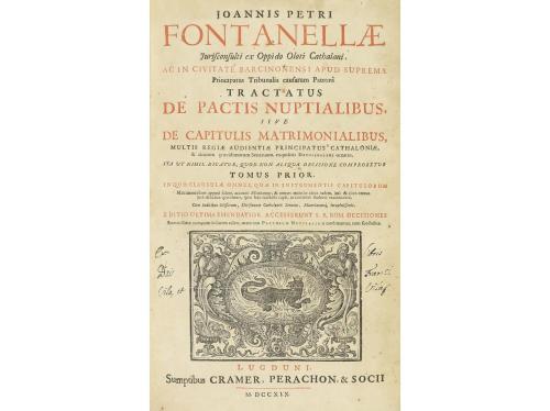 1719. LIBRO. (DERECHO). TRACTATUS DE PACTIS NUPTIALIBUS DE CAPITULIS MATRIMONIALIBUS, MULTIS REGIAE AUDIENTIAE PRINCIPATUS CATHALONIAE... Lugduni [Lyon]: Imp. Cramer, Perachon & Socii, 1719. 2 vol. folio mayor. I: 6 h. + 540 p. + 30 h. II: 9 h. + 588 p.+ 38 h. + 131 p. Portada del primer vol. a dos tintas y con grabado, viñetas, capitales. Texto a dos columnas. Algún punto de óxido. Dos vol. enc. en plena piel, nervios, cortes pintados, planos muy rozados y con peladuras. Palau 93379. [Más:] DECISIONIS SACRI REGII SENATUS CATHALONIAE. Coloniae Allobrogum: Perachon & Cramer, 1735. 2 vol. I: 14 h. + 576 p. II: 10 h. + 620 p. + 96 h. S. ROTAE ROMANAE DECISIONES... Id. 4 h. + 123 p. + 8 h. Grabado xilográfico en las portadas. Texto a dos columnas. Puntos de óxido. Dos vol. enc. en plena piel, planos rozados y con peladuras en el segundo vol. el cajo anterior sesgado y faltas en los cantos. Dos obras del jurista Fontanella en 4 vol. en total.