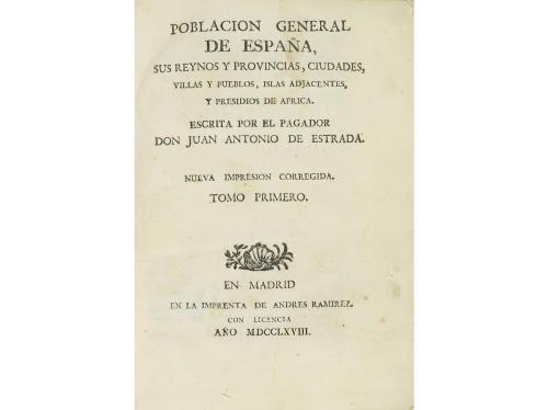 1768. LIBRO. (POLÍTICA-CENSO). POBLACION GENERAL DE ESPAÑA, SUS REYNOS Y PROVINCIAS, CIUDADES, VILLAS Y PUEBLOS, ISLAS ADJACENTES, Y PRESIDIOS DE AFRICA. Madrid: Imp. de Andres Ramirez, 1868. 2 vol. en 8º mayor. I: 16 h. + 499 p. Fina galería en el margen interior de las primeras hojas. II: 2 h. + 708 p. Pequeña falta en la esquina superior de las dos primeras hojas, sin afectar texto. Capitales xilográficas. Dos vol. enc. en pergamino de época, el segundo semidesprendido.