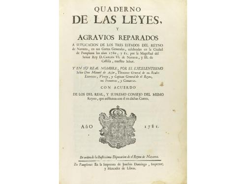 1781. LIBRO. (DERECHO). QUADERNO DE LAS LEYES, Y AGRAVIOS REPARADOS A SUPLICACION DE LOS TRES ESTADOS DEL REYNO DE NAVARRA, EN SUS CORTES GENERALES, CELEBRADAS EN LA CIUDAD DE PAMPLONA LOS AÑOS 1780, Y 81. Pamplona: Imp. Joachin Domingo, 1781. 4º mayor. 2 h. + 254 p. Texto a dos columnas. Escudo xilográfico en la portada. Cabeceras y capitales xilográficas. Margen de las cuatro últimas hojas recortado, sin afectar caja de texto. Enc. en pergamino de época, guardas nuevas. Algún leve cerco de humedad. CCPB 180964-4. Palau, 242646. Aguilar Piñal, I, 3208.