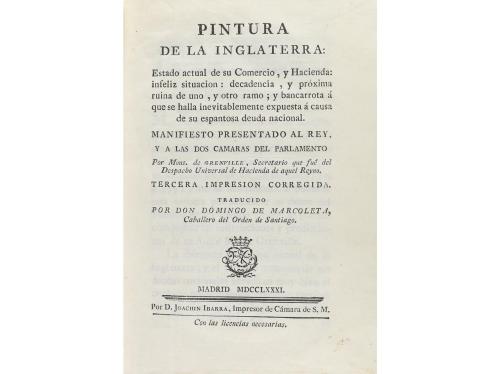 1781. LIBRO. (POLÍTICA). PINTURA DE LA INGLATERRA: ESTADO ACTUAL DE SU COMERCIO, Y HACIENDA: INFELIZ SITUACION: DECADENCIA, Y PRÓXIMA RUINA DE UNO, Y OTRO RAMO; Y BANCARROTA Á QUE SE HALLA INEVITABLEMENTE... Trad. Domingo de Marcoleta. Madrid: Imp. Joachin Ibarra, 1781. 8º mayor. 1 h. + VI + 86 p. Enc. en pasta española, tejuelo parcial, lomera rozada, cortes pintados.