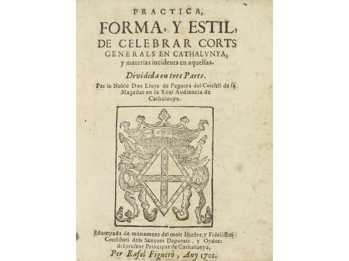 1701. LIBRO. (DERECHO CATALÁN). PRACTICA, FORMA, Y ESTIL, DE CELEBRAR CORTS GENERALS EN CATHALUNYA, Y MATERIAS INCIDENTS EN AQUELLAS. Barcelona: Imp. Rafel Figuerò, 1701. 8º mayor. 8 h. + 104 p. + 22 h. Apostillas marginales. Portada con grabado xilográfico. Finas galerías marginales. Enc. en pergamino de época. Palau 216351.