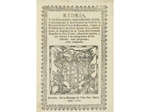 1703. LIBRO. (DERECHO CATALÁN). REDRES Y ORDINACIONS NOVAMENTS FETAS, y estatuidas por la Savi Concell de Cent de la Excelentissima Ciutat de Barcelona, tingut, y Celebrat als 30. de Abril del any 1703. concernents, al Regimen de la. Barcelona: Estampa de Ioan Pau Marti, 1703. 8º mayor. Portada grabada al xilográfico + 92 p.+ 6 h. Enc. pergamino de época. Palau 253109. CCPB 404134-8.