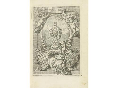 1750. LIBRO. (DERECHO). ESTATUTOS Y PRIVILEGIOS APOSTOLICOS, Y REALES DE LA UNIVERSIDAD, Y ESTUDIO GENERAL DE CERVERA. Cerver: Por Josef Barber, 1750. 4º mayor. Frontis grabado + 4 h. + 238 p. + 15 h. La última con un grabado xilográfico de la inmaculada, en orla xilográfica. Cabecera y frontis grabados calcogáficos, por P. Bianchi y H. Rossi. Portada a dos tintas. Texto con apostillas marginales. Enc. en pergamino, lomera rotulada. Palau, 83603. CCPB 180024-8.