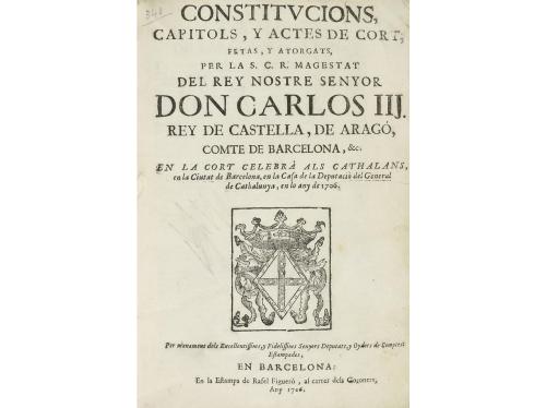 1706. LIBRO. (DERECHO CATALÁN). CONSTITUCIONS, CAPITOLS, Y ACTES DE CORT, FETAS, Y ATORGATS, PER LA S.C.R. MAGESTAT DEL REY NOSTRE SENYOR DON CARLOS III REY DE CASTELLA, DE ARAGO, COMTE DE BARCELONA, En la cort celebrá als cathalans. Barcelona: Estampa de Rafel Figuerò, 1706. Folio menor. 6 h. + 196 p. Capitales y cabeceras xilográficas. Portada ilustrada con escudo xilográfico. Enc. en pergamino de época, lomera con reparación. Palau 60387. CCPB 95834-X.