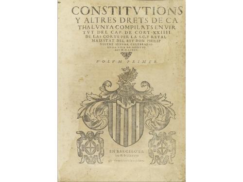 1588. LIBRO. (DERECHO). CONSTITUCIONS Y ALTRES DRETS DE CATHALUNYA compilats en virtut del cap. XXIIII. de les Corts per la S.C. y Reyal Maiestat del Rey Don Philip nostre senyor celebradas en la vila de Montso any MDLXXXV. Barcelona: en casa de Hubert Gotard, 1588-89. 3 tomos en 1 vol. en folio mayor. 27 h.+ 584 p.+ 18 h. [Sigue: ] PRAGMATICAS Y ALTRES DRETS DE CATHALUNYA COMPILATS EN VIRTUT DEL CAP DE CORT XXIIII (...) Id.: 1589. 2 h. + 171 p.+ 4 h. [Sigue:] CONSTITUTIONS Y ALTRES DRETS DE CATHALUNYA, SUPERFLUOS CONTRARIS, Y CORREGITS COMPILATS EN VIRTUT DEL CAP DE CORT... 2 h. + 72 p. Enc. en pergamino, lomera rotulada, algo corto en el margen derecho, apreciable sólo en las portadas. Cada parte con portada propia y con gran escudo de Cataluña xilográfico. A dos columnas, capitales y culs-de-lampe xilográficos. CCPB 285129-6. Palau 60360: "segunda edición de este Corpus jurídico de Cataluña, que algunos denominan Usatges... Al fin del tomo primero consta que fueron impresos por Hubert Gotard, y en las portadas se señala el coste de los tres volúmenes en seis libras catalanas".