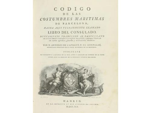 1791. LIBRO. (DERECHO MARÍTIMO). CODIGO DE LAS COSTUMBRES MARÍTIMAS DE BARCELONA, HASTA AQUI VULGARMENTE LLAMADO LIBRO DEL CONSULADO. NUEVAMENTE TRADUCIDO AL CASTELLANO CON EL TEXTO LEMOSÍN RESTITUIDO A SU ORIGINAL INTEGRIDAD Y PUREZ. Madrid: en la Imprenta de don Antonio de Sancha, 1791. 2 tomos en 1 vol. 4º menor. I: LXXXII + 368 p. II: 224 p. + 1 hoja. Texto a dos columnas, buen papel. Las dos portadas ilustradas con viñeta central, grabada al cobre por Blas Ametller en 1791 según dibujo de Luis Paret; una viñeta frontal al empezar el ´Discurso del editor´, grabada al cobre por Moles, según dibujo de Montaña; una gran viñeta frontal al empezar el texto, grabada al cobre por PP. Moles, según dibujo de Luis Paret; viñeta frontal al empezar el texto del ´Apéndice´ grabada y dibujada por los mismos. Enc. de la época en plena piel, hilos dorados en ambos planos, doble tejuelo, lomera cuajada, cortes dorados. La mejor edición crítica de los diversos textos de la legislación marítima catalana conocida con el nombre genérico de ´Consolat del Mar´. Textos en catalán y castellano. Palau 43353.