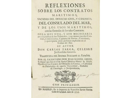 1753. LIBRO. (DERECHO MARÍTIMO). REFLEXIONES SOBRE LOS CONTRATOS MARITIMOS, SACADAS DEL DERECHO CIVIL, Y CANONICO, DEL CONSULADO DEL MAR, Y DE LOS USOS MARITIMOS, CON LAS FORMULAS DE LOS TALES CONTRATOS... Madrid: Imp. Francisco Xavier Garcia, 1753. 8º mayor. 14 h. + 330 p. + 3 h. Enc. en pergamino de época. Primera edición en lengua castellana de esta obra escrita por un ´jurisconsulto Genovés´ en la que recoge toda la legislación a tener en cuenta en el comercio marítimo, consulados, capitanes de navíos, y qualquier tráfico de mercancías por mar. Una obra que recoge y renueva la legislación que contenía el célebre ´Consolat de Mar´ catalán, que tanto se usó en el mediterraneo desde el siglo XIV al XVIII. Se publicó originalmente en italiano, Genova 1692.