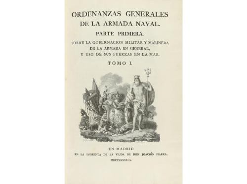 1793. LIBRO. (DERECHO MARÍTIMO). ORDENANZAS GENERALES DE LA ARMADA NAVAL. Madrid: Imp. Vda. de Joachin Ibarra, 1793. 2 vol. en 4º mayor. I: 2 h. + 518 + L p. II: 2 h. + 574 + LIV p. Viñetas grabadas por A. Carnicero y F. Selma. Ejemplar limpio. Fina galería al principio del segundo vol. Dos vol. enc. en pasta española, nervios, tejuelo y cortes pintados, puntas rozadas y restauración en el lomo. Palau 202627, dice de ella que es una bella edición e impresión, como la mayoría de las piezas de las prensas de Ibarra.
