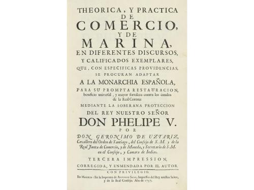 1757. LIBRO. (DERECHO MARÍTIMO). THEORICA, Y PRACTICA DE COMERCIO, Y DE MARINA, EN DIFERENTES DISCURSOS, Y CALIFICADOS EXEMPLARES, QUE, CON ESPECIFICAS PROVIDENCIAS, SE PROCURAN ADAPTAR A LA MONARCHIA ESPAÑOLA... Madrid: Imp. Antonio Sanz, 1757. 4º mayor. 18 h. + 454 p. Cabecera calcográfica y capitales y culs-de-lampe xilográficas. Texto a dos columnas. Enc. en pasta española, tejuelo, nervios, cortes pintados, alguna peladura en los planos. Tercera edición. Palau 346510. El autor sigue los postulados de Colbert y aunque se propone introducirlos en España, esta no está preparada para adoptar la modernidad de los cambios.