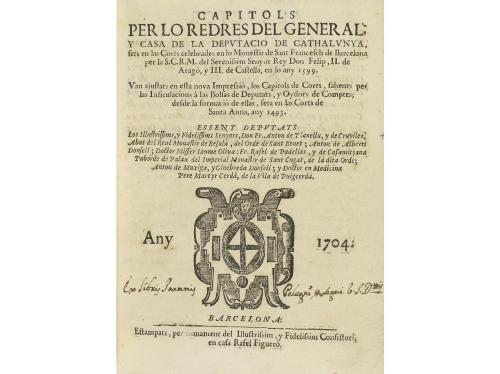 1704. LIBRO. (DERECHO CATALÁN). CAPITOLS PER LO REDRES DEL GENERAL Y CASA DE LA DEPUTACIO DE CATHALUNYA. Fets en las Corts celebrades en lo Monestir de Sant Francesch de Barcelona per la S.C.R.M. del Serenissim Senyor Rey Don Felip,. Barcelona: en casa Rafel Figuero, 1704. 8º. 12 h. + 218 p. Grabado xilográfico en portada, capitales xilográficas. Antiguas anotaciones manuscritas marginales. [Sigue:] CAPITOLS DEL GENERAL DEL PRINCIPAT DE CATHALUNYA... Id.: Estampa de Ioan Pau Marti, 1702. 12 h. + 136 p. + 1 h. Capitales y culs-de-lampe xilografiadas. 2 obras enc. en un vol. por Jordi de la Rica, en pergamino reciente, con hierros dorados en ambos planos, nervios, tejuelo, corte superior dorado.