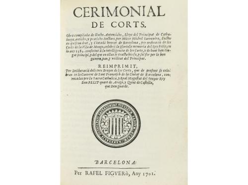1701. LIBRO. (DERECHO-GUERRA SUCESIÓN). CERIMONIAL DE CORTS. OBRA COMPILADA DE LLOCHS AUTENTICHS, LLEYS DEL PRINCIPAT DE CATHALUNYA... REIMPRIMIT PER DELIBERACIÓ DELS TRES BRAÇOS DE LAS CORTS... Barcelona: Rafel Figueró, 1701. 8º mayor. 4 h. + 51 p. Capitales grabadas, apostillas marginales. Escudo xilográfico en la portada. Enc. por Jordi de la Rica en plena piel, ruedas en seco en ambos planos, tejuelo, corte superior dorado.
