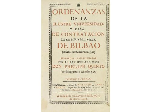 1738. LIBRO. (DERECHO-BILBAO). ORDENANZAS DE LA ILUSTRE UNIVERSIDAD Y CASA DE CONTRATACION DE LA M.N. Y M.L. VILLA DE BILBAO (INSERTOS SUS REALES PRIVILEGIOS) APROBADAS, Y CONFIRMADAS POR EL REY NUESTRO SEÑOR DON PHELIPE QUINTO. Vizcaya: Oficina de la Viuda de Antonio de Zafra y Rueda, 1738. Folio menor. Frontis grabado al cobre por Joseph Ant. de Rementeria + 2 h. + 308 p. + 30 h. de índices. Portada a dos tintas. Algunas capitales y cul-de-lampe xilográficos. Enc. en plena piel de época, nervios, tejuelo, cortes pintados. No en Palau. CCPB 189932-5.