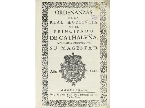 1742. LIBRO. (DERECHO CATALÁN). ORDENANZAS DE LA REAL AUDIENCIA DE EL PRINCIPADO DE CATHALUÑA. MANDADAS IMPRIMIR POR SU MAGESTAD. Barcelona: Joseph Texido, impresor del Rey, 1742. 4º. 3 h. + 144 p. + 2 h. En la portada orla tipográfica y escudo real grabado en madera. Capitales y culs-de-lampe xilografiadas. Texto a dos columnas con apostillas marginales. Ex-libris de caucho en la portada. Enc. en pergamino de la época. Edición original. En 1716, Felipe V, instauró un nuevo tribunal en el Principado, para las causas tanto civiles como criminales, y también para lo gubernativo. Palau 202661.