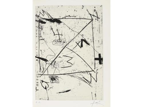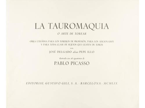 1980. LIBRO. (FACSÍMIL-PICASSO). LA TAUROMAQUIA O ARTE DE TOREAR. OBRA UTILISIMA PARA LOS TOREROS DE PROFESIÓN, PARA LOS AFICIONADOS Y PARA TODA CLASE DE SUJETOS QUE GUSTEN DE TOROS. Barcelona: Ed. de la Cometa, 1980. Folio apaisado. 142 p. y 26 reproducciones de las aguatintas firmadas de Picasso presentadas en suite. En rama con carpeta ilustrada, presentada en caja de arpillera estampada. Edición numerada de 1500 ejemplares. Se trata del facsímil de la obra que Gustavo Gili publicó en 1959. A finales de los años cincuenta Picasso asistió a una corrida de toros de Arles y allí realizó las ilustraciones para este libro.