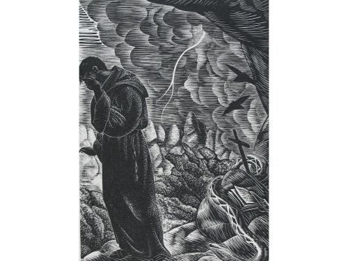 1948. LIBRO. (BIBLIOFILIA). AIRES DE LLEGENDA. Barcelona: Ed. Montserrat Borrat Obra Gráfica, 1948. Folio menor. 89 p. Profus. ilustr. con xilografías originales, muy bellas de E. Ricart. Presentado en rama, funda y petaca nueva de tela. Ejemplar de la tirada de 175 ejemplares en papel de hilo, de un total de 225.