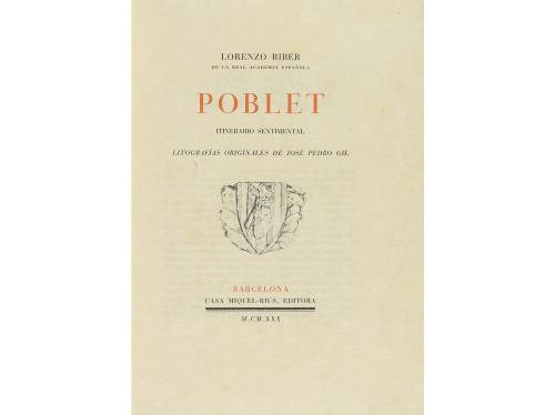 1930. LIBRO. (BIBLIOFILIA). POBLET. ITINERARIO SENTIMENTAL. Barcelona: Casa Miquel Rius Editora, 1930. 4º mayor. 66 p. + 1 h. Ilustr. con litografías de José Pedro Gil. Leve sombra de óxido. Rústica y funda de cartoné. Ejemplar de los 50 tirados sobre papel japón, de un total de 200.