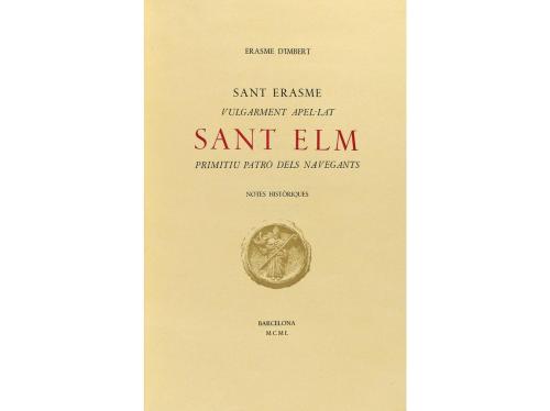 1950. LIBRO. (BIBLIOFILIA). SANT ERASME VULGARMENT APEL·LAT SANT ELM, PRIMITIU PATRO DELS NAVEGANTS. Barcelona: Imp. Altés, 1950. Folio mayor. 107 p., 1 h. Intonso. Ilustr. fotográficas sobrepuestas. Cartoné con sobrecubierta original. Tiraje de 250 ejemplares numerados y nominados, sobre papel de hilo "castells" de la casa Guarro. Con una dedicatoria. Curiosa obra de notas históricas e iconográficas sobre el patrón de los navegantes.
