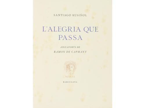 1947. LIBRO. (BIBLIOFILIA). L'ALEGRIA QUE PASSA. Barcelona: Medusa, 1947. Folio. 118 p. + 8 h. Ilustr. por RAMON DE CAPMANY con lám., viñetas y culs-de-lampe. Puntos de óxido. Tiraje de los 11 maracados con una letra, este letra C, que contiene un dibujo original de una de las planchas, una rechazada, todos los estados correspondientes a la misma serie y tres series de grabados: una plancha sin cortar, una con sanguina y el resto con el estado definitivo de las planchas, todo sobre papel extra-blanco Guarro. En rama, rústica, presentado en funda de medio pergamino y petaca de cartoné.