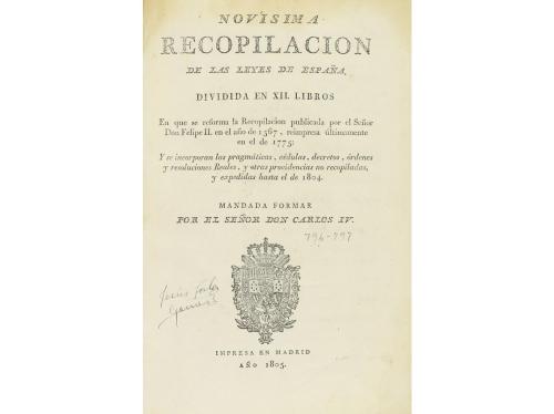 1805. LIBRO. (DERECHO). NOVÍSIMA RECOPILACION DE LAS LEYES DE ESPAÑA. DIVIDIDA EN XII LIBROS... MANDADA FORMAR POR EL SEÑOR DON CARLOS IV. Madrid: Impreso en Madrid, 1805. 5 tomos enc. en 3 vols. en folio: Vol. I: (Tomo 1º, Libros I y II. Tomo 2º, Libros III, IV y V) 2 h., VIII folios, XXVI p., 6 h., 338 p.; Vol. II: (Tomo 3º, Libros VI y VII) 3 h., 492 p.; 3 h., 278 p., 451 p.; 2 h., 400 p.; Vol. III: (Tomo 4º, Libros VIII y IX. Tomo 5º, Libros X, XI y XII) 3 h., 530 p.). Escudo grabado en la portada (el tomo 1º es el único que lleva portada, los siguientes se editaron empezando una hoja con el título de la obra y el Nº de tomo). Texto a dos columnas. Tres vol. enc. en pasta española, doble tejuelo, cortes pintados, planos rozados, ex-libris heráldico de caucho. Palau, 195750. Fundamental recopilación legislativa, encargada por el rey en 1799 a Juan de la Reguera, de la Cancillería de Granada, quien reunió todas las leyes vigentes en España, corrigiendo errores o repeticiones, y formando así un cuerpo legislativo de derecho, indispensable para el buen gobierno y recta administración de los reinos de España en todos los campos: administración política y local, derecho penal, derecho civil, leyes culturales, sobre ciencias, artes u oficios, deberes para con la hacienda pública, contratos y obligaciones, testamentos, etc. La obra contiene un último volumen con un índice por orden alfabético, otro cronológico y un tercero por materias.