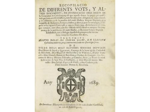 1689. LIBRO. (DERECHO CATALÁN-ENCUADERNACIÓN). RECOPILACIO DE DIFERENTS VOTS, Y ALTRES DOCUMENTS, EN JUSTIFICACIO DELS DRETS DE GENERALITAT DE CATHALUNYA, Y DE QUE AQUELLS DEUEN SER PAGATS PER QUALSEVOLS PERSONA, AIXI ECLESIASTICAS, COM SECULARS.. Barcelona: Rafel Figueró, 1689. 8º mayor. 4 h. + 301 p. Sombra de óxido. Enc. en pergamino de época. Palau 252441-42.