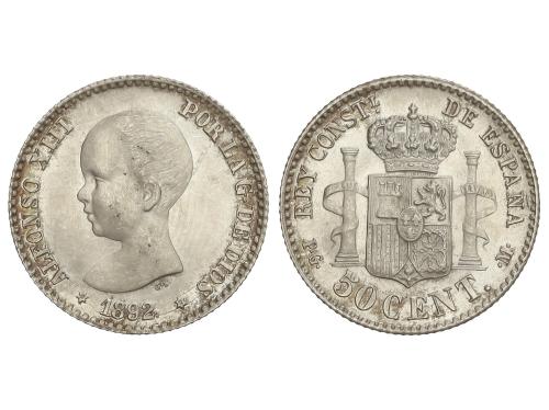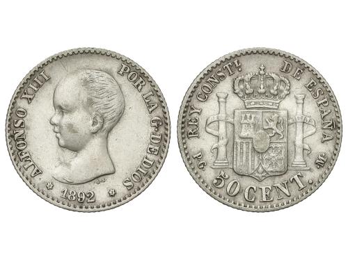 ALFONSO XIII. 50 Céntimos. 1892 (*9-2). P.G.-M. Brillo original. (Pequeños golpecitos en anverso). AC-38. EBC+/SC.