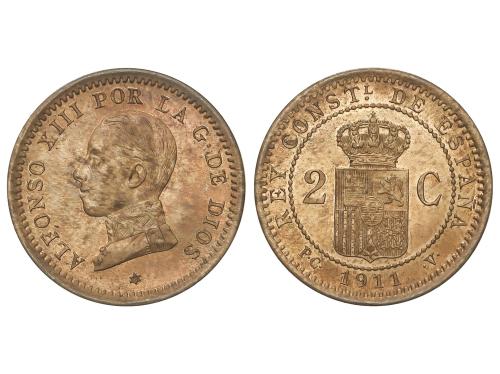 ALFONSO XIII. 2 Céntimos. 1911 (*19). P.C.-V. Error en fecha estrella. Brillo original. RARA. AC-14; VS-133, 1. SC-.
