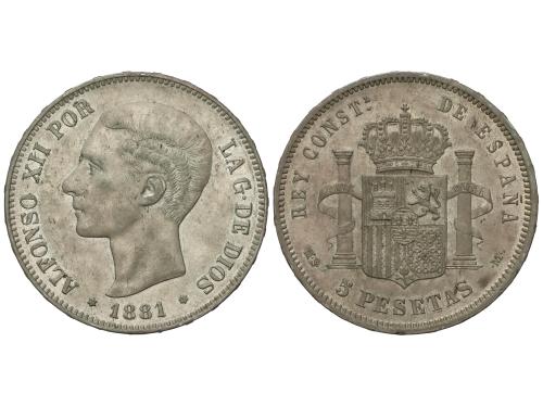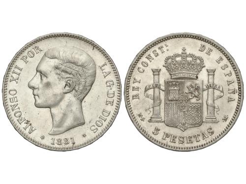 ALFONSO XII. 5 Pesetas. 1881 (*18-81). M.S.-M. Pátina y restos de brillo. ESCASA ASI. AC-44. EBC.