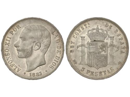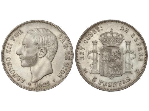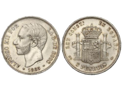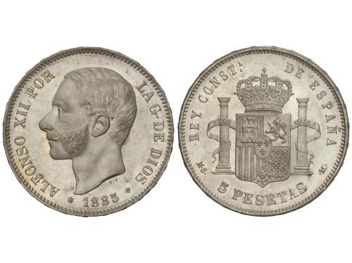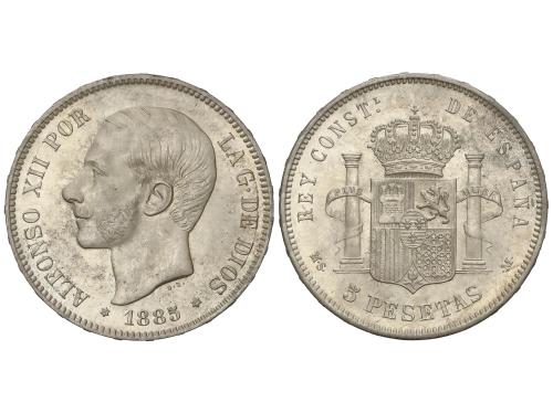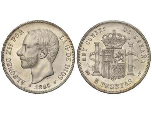 ALFONSO XII. 5 Pesetas. 1885 (*18-87). M.S.-M. (Pequeña zona pulida en reverso). Brillo original. AC-62. EBC+. Ex Soler y Llach y Martí Hervera 1112 - 27 febrero 2020, n. 802.