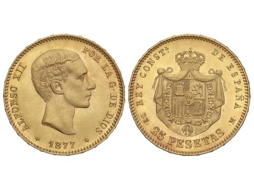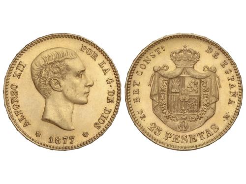 ALFONSO XII. 25 Pesetas. 1877 (*18-77). D.E.-M. 8,05 grs. AU (900). AC-68. SC-.