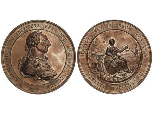 ALFONSO XII. Medalla. 1877. CENTENARIO DE LA ACADEMIA DE LA MINERÍA. MADRID. Anv.: A CAROLO III REGE INSTITVTA PERACTVM MEMORAT SECVLVM. Busto de Carlos III a derecha. Rev.: HISPANA METACLINORVM ACADEMIA MATRITI MDCCCLXXVII. Matrona sentada, con brazo apoyado en un escudo con dos martillos cruzados. 243,11 grs. AE. Ø 70 mm. (Infimas oxidaciones). RAH-677. SC.