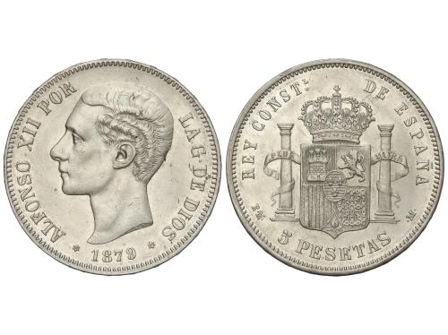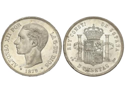 ALFONSO XII. 5 Pesetas. 1879 (*18-79). E.M.-M. Extraordinario ejemplar. (Manchitas). Pleno brillo original. MUY RARA ASÍ. AC-42. SC-.