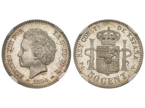 ALFONSO XIII. 50 Céntimos. 1894 (*9-4). P.G.-V. Encapsulada por NGC MS 65+ (n. 6681394-003). Pleno brillo original. MUY BELLA. AC-43. SC.