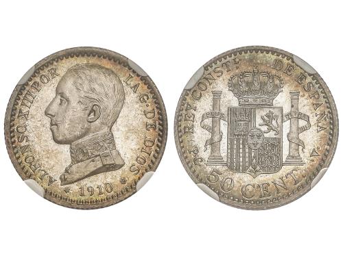 ALFONSO XIII. 50 Céntimos. 1910 (*1-0). P.C.-V. Encapsulada por NGC MS 65 (n. 2800438-005). Pleno brillo original. AC-48. SC.